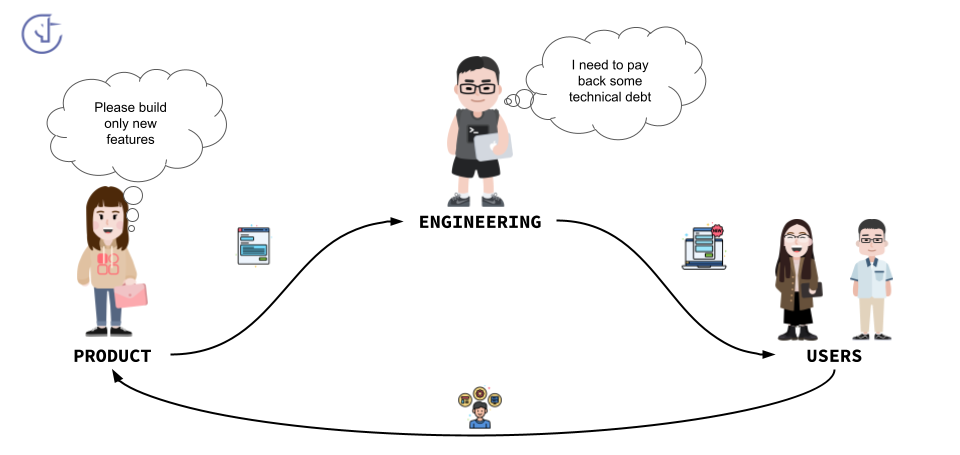 Enfin, un dysfonctionnement classique dans la relation product–engineering est la pression pour ne construire que de nouvelles fonctionnalités, sans que les ingénieurs passent ne serait-ce qu’une heure sur la roadmap technique. Cette situation est normale pour une startup en tout début de vie, qui cherche encore son product-market fit. Mais une fois ce stade franchi, beaucoup d’entreprises oublient qu’elles ont accumulé de la dette technique… et qu’il faudra bien la rembourser.
